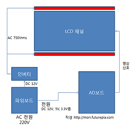 TV, 모니터의 내부 기기 구성도 총정리 LCD TV나 모니터를 보면 무척 복잡해 보입니다. 컴퓨터로부터 영상 신호를 받아 이것을 컬러로 재생해야 되기 때문입니다. 그러나 아무리 복잡한 것이라도 이것을 단순화 하여 블럭 개념으로 놓고 공부하면 이해하기 쉽습니다. 이에 TV나 모니터 내부의 구성도를 아래와 같이 설명 드리고자 합니다. TV나 모니터(이하 모니터)에서 교류 전원(AC)을 입력 받아 직류 전원(DC)으로 바꾸는 회로를 파워(Power)보드라고 합니다. 그리고 이 떄 만들어진 직류 전원이 다른 보드들에 전달됩니다. 인버터는 파워 보드로부터 직류를 입력 받아 이것을 1천 볼트(RMS 기준 약 750V) 수준의 고압 교류 전원으로 바꿔 주는 보드입니다. 고압 전원은 모니터의 상, 하단에 설치되어 있는 CCFL이라는 형광등에 공급되어 환하게.. 더보기 이전 1 ··· 94 95 96 97 98 99 100 ··· 106 다음